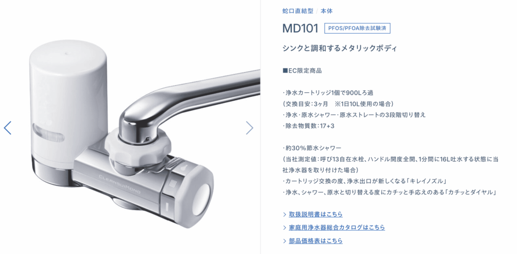 - カートリッジ1つで900L(交換目安3ヶ月:1日10L)