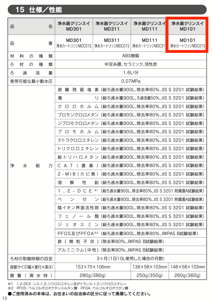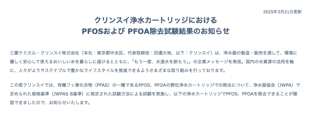 なんだよ、クリンスイも最近話題のPFOS、PFOA除去できるんじゃんとこの記事のために調べて知りました