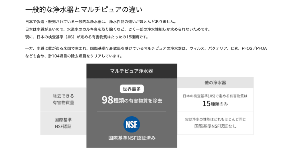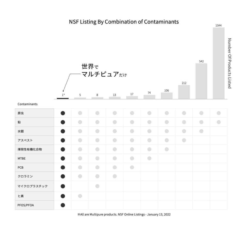 そして、PFOS/PFOAやヒ素を含めた100種類以上の有害物質を除去できる製品は、マルチピュアの1種類のみです。(2022年12月NSFリスティングより)
